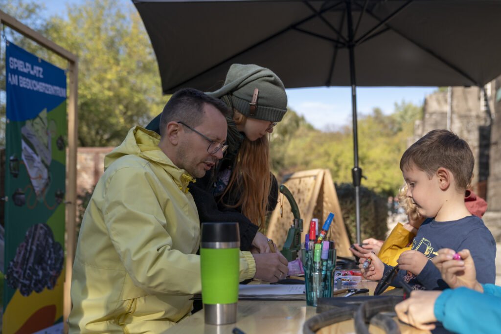 An insgesamt vier Tagen waren die Urbanisten in den letzten Wochen im Landschaftspark Duisburg-Nord, um mit Kindern und Familien über die Neugestaltung von insgesamt vier Spielplätzen ins Gespräch zu kommen. Dazu bauten sie auf dem Spielplatz am Klettergarten (mit der bekannten Tunnelrutsche durch eine Erzbunkerwand) einen Mitmachstand mit Sitz- und Spielmöglichkeiten auf. Kinder konnten sich dort Upcycling-Schlüsselanhänger aus alten Fahrradreifen basteln. Anhand von bunten Bannern, die Pläne und Fotos der Spielplätze zeigten, konnten die Besucherinnen und Besucher über die Zukunft der Spielplätze und ihre Wünsche sprechen. Vor allem von den Kindern und Jugendlichen wollten die Urbanisten wissen, was sie gerne auf den Spielplätzen machen und welche Veränderungen sie sich wünschen.