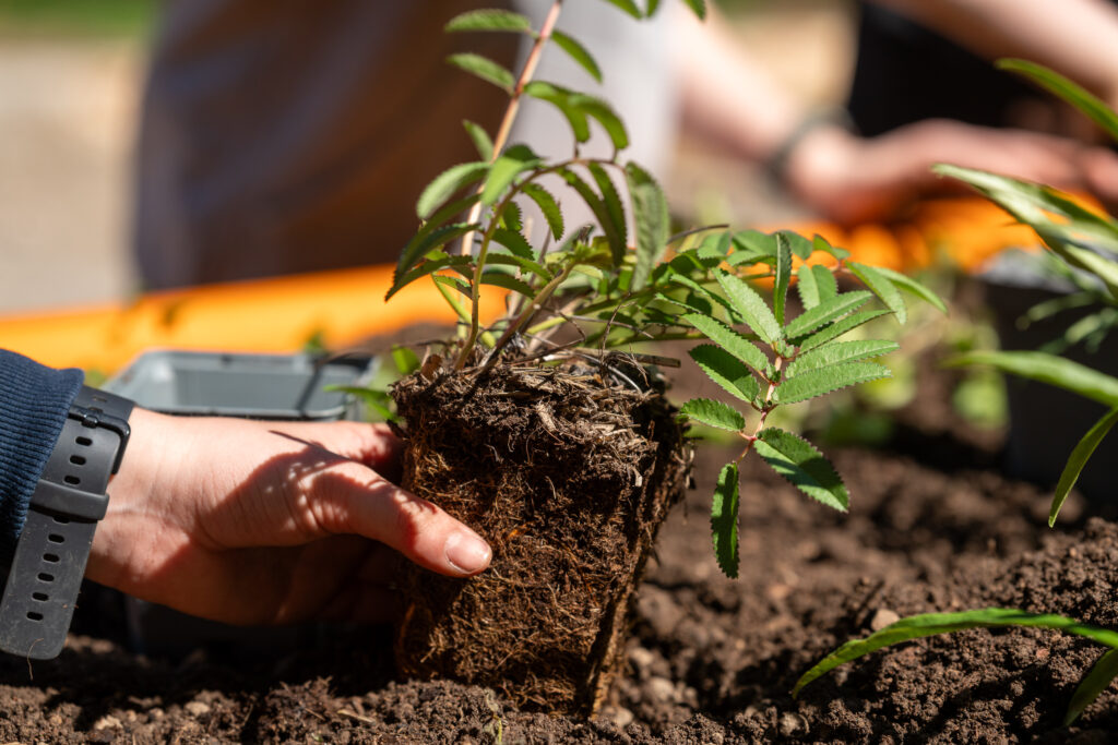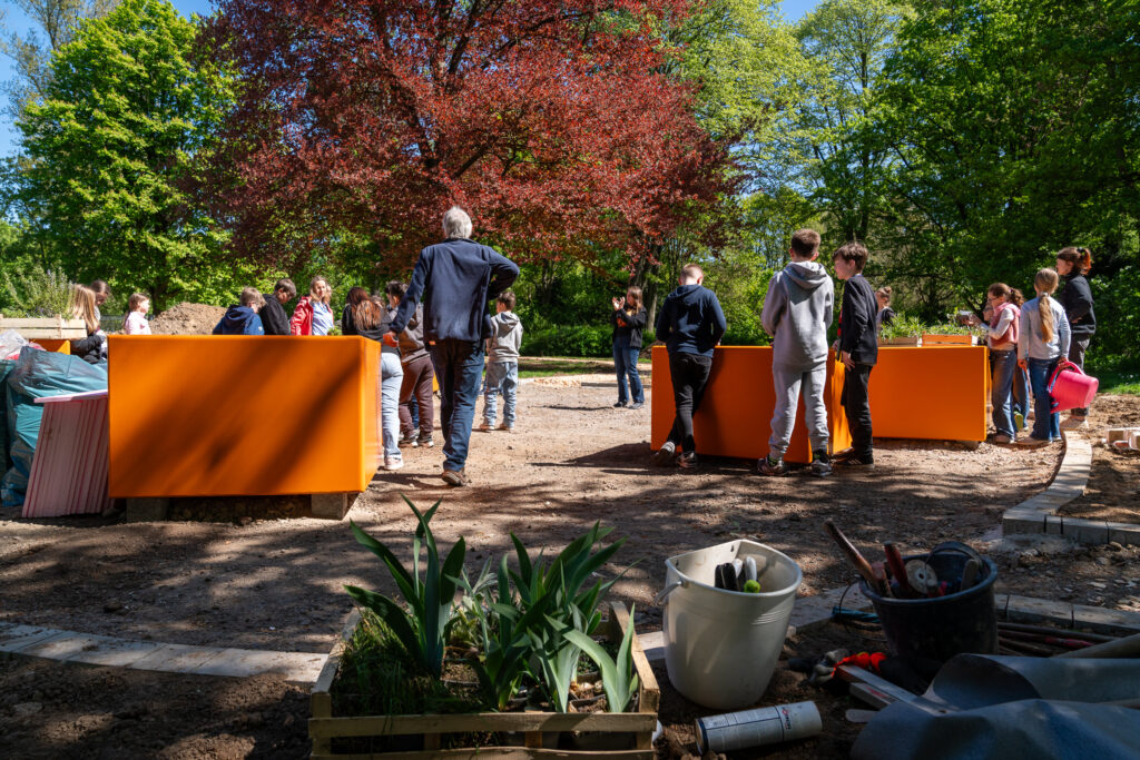 Der Gemeinschaftsgarten wird künftig Teil der Klimaroute im Park. Da die Bauarbeiten aktuell noch laufen, fand die Pflanzaktion mitten auf der Baustelle statt. Direkt nebenan entsteht außerdem das Biegerzimmer: ein Lernort im Freien für die benachbarten Schulen, Jugendzentren und Kitas.